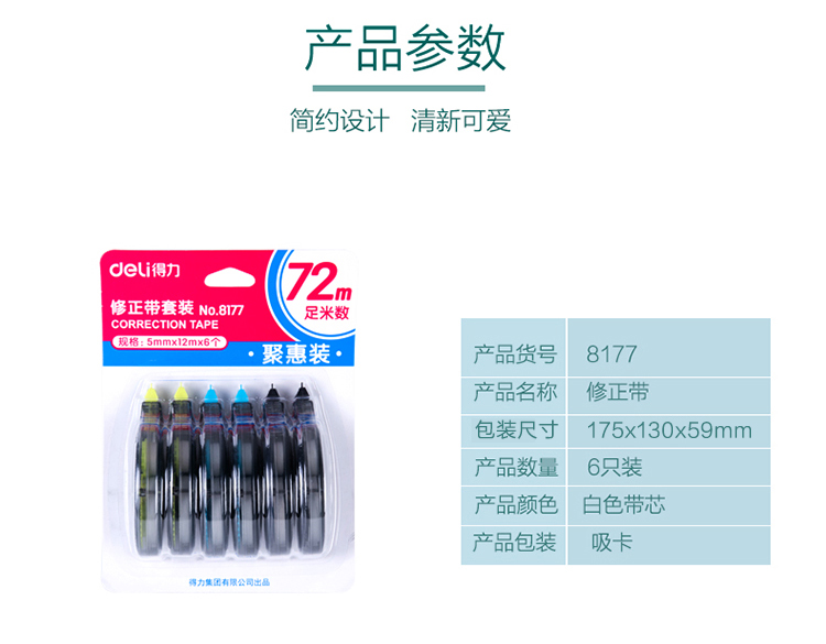 “deli/得力”8177 学生12m修正带/涂改带/改正带 6个卡装(海洋电脑 0418商城)
