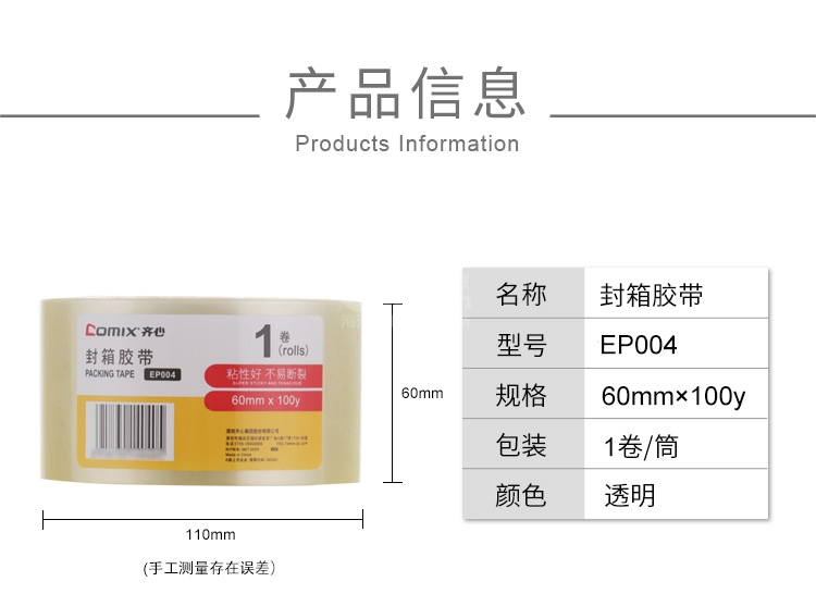 “COMIX/齐心”EP004 透明封箱胶带 单卷装(宽60mm*长91.4米/卷快递打包)