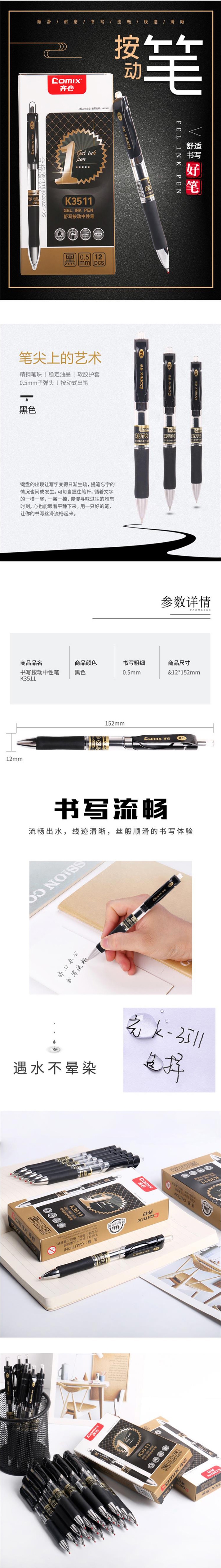“COMIX/齐心”K3511 中性笔 单支装(黑色碳素笔0.5mm按动笔水笔学生办公用12支/盒)