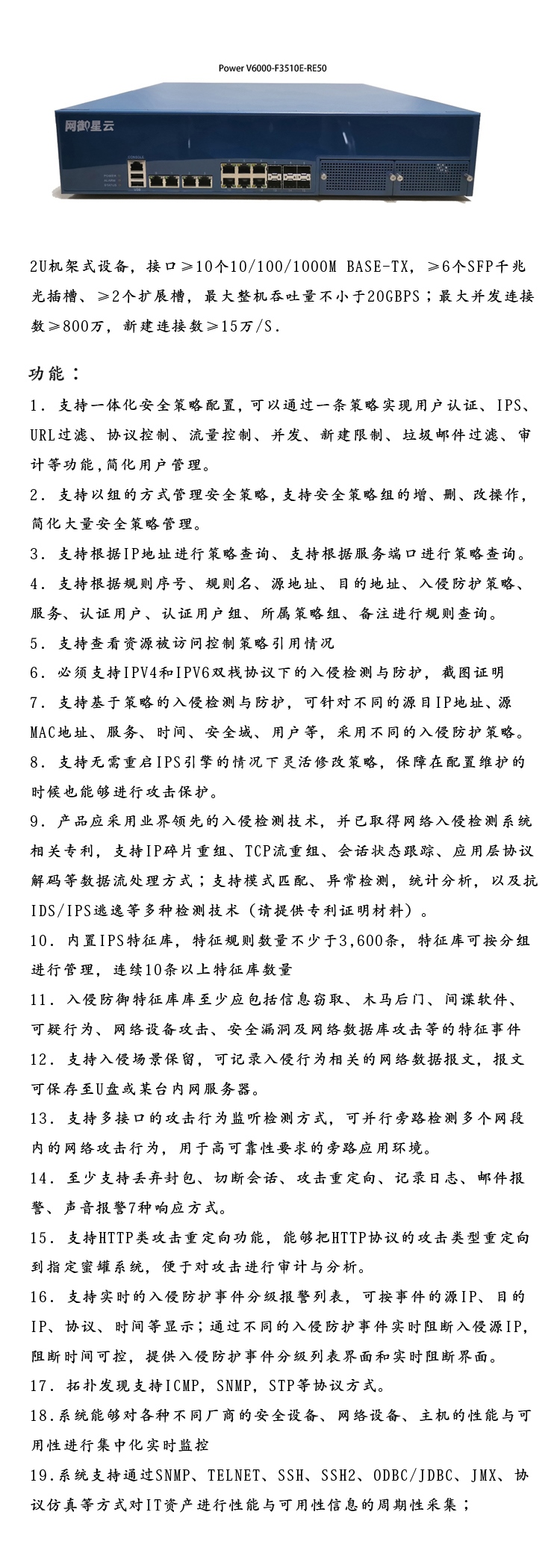 “网御星云”Power V6000-F3510E-RE50 路由器 单台装(防火墙系统≥6个SFP千兆光插槽/≥2个扩展槽)