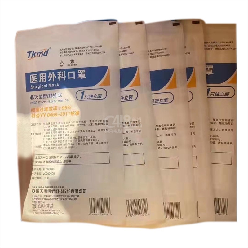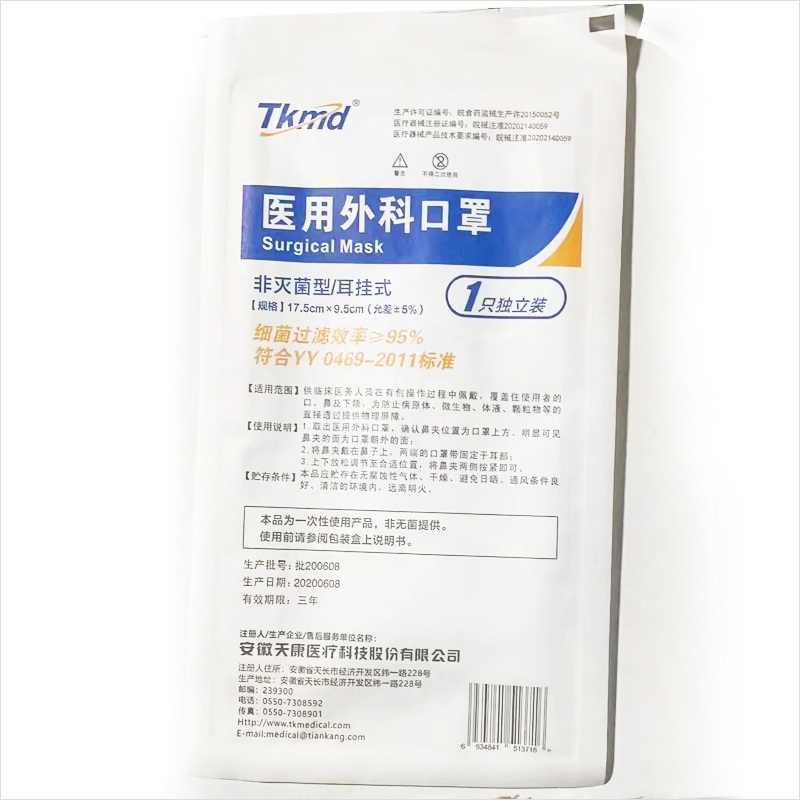 “Tkmd”非灭菌型/耳挂式 口罩 单只装(一次性医用外科17.5*9.5cm独立包装)