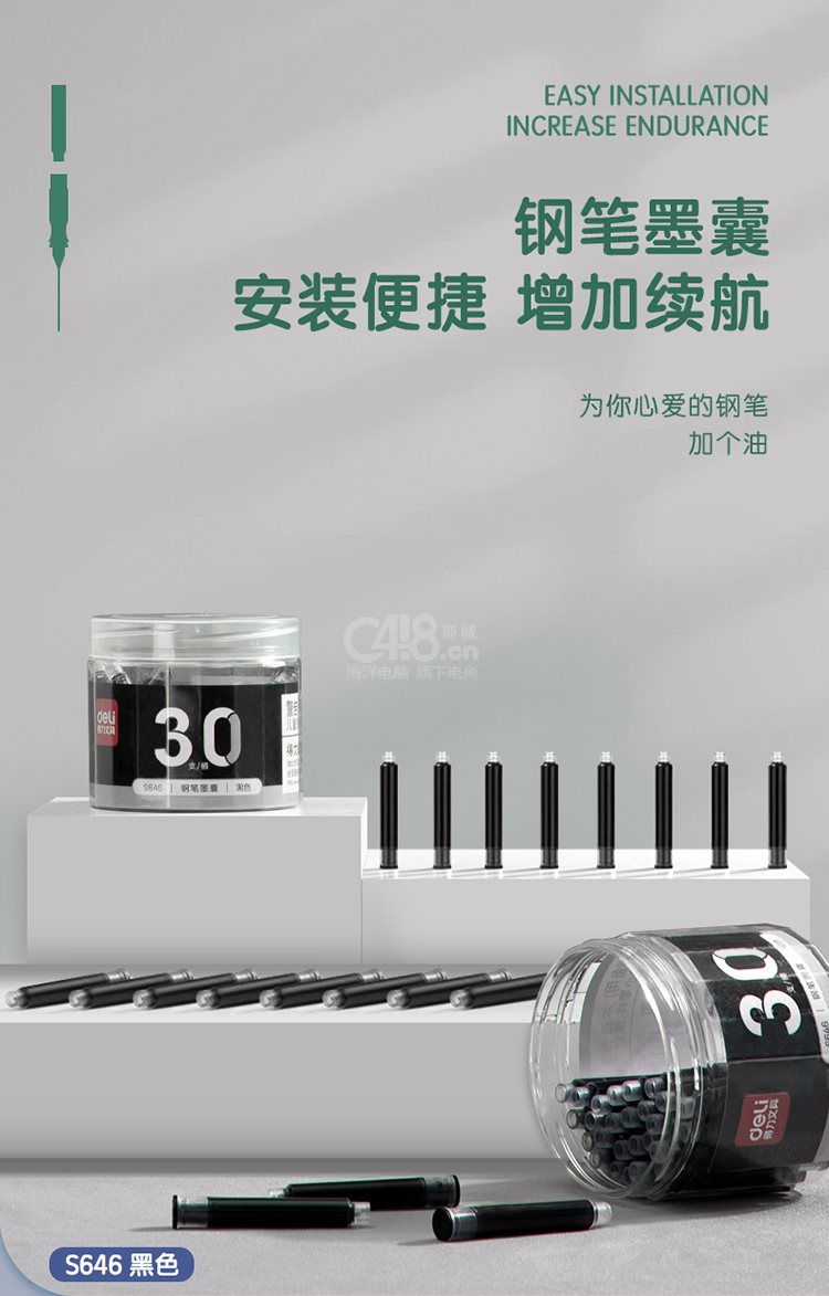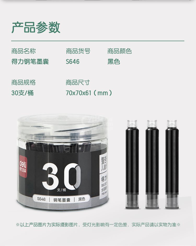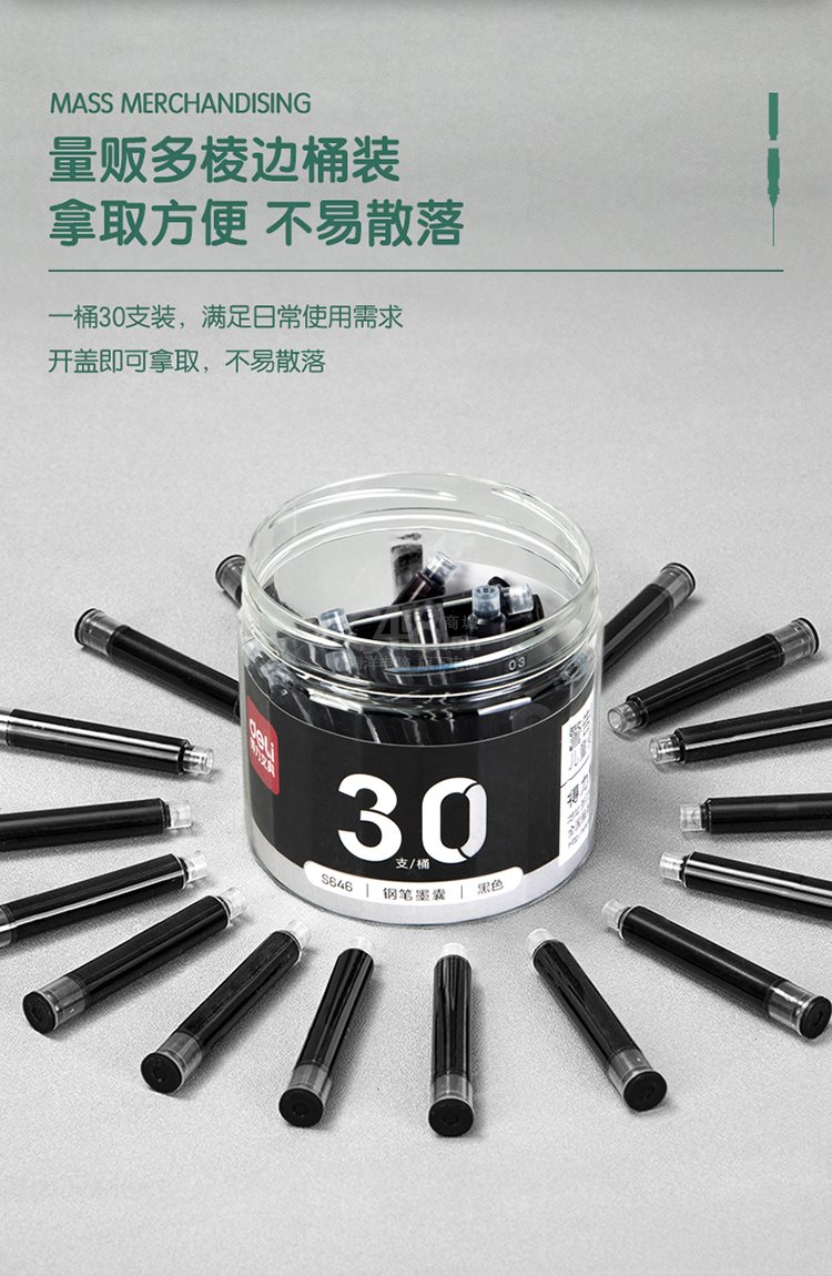 “deli/得力”S646 钢笔墨囊 30支/桶装(黑色学生钢笔墨水笔囊可替换中包装DL-S646)