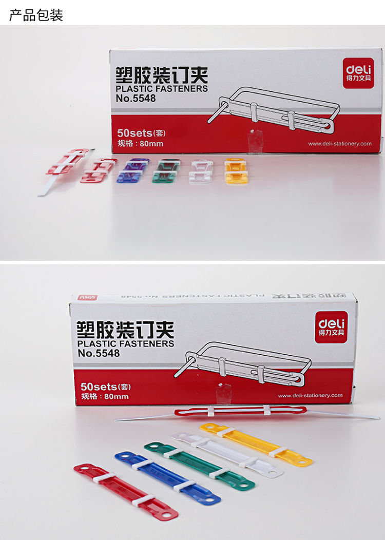 “deli/得力”No.5548 塑胶装订夹 1盒装(混色80mm耐弯折可重复使用50套/盒)