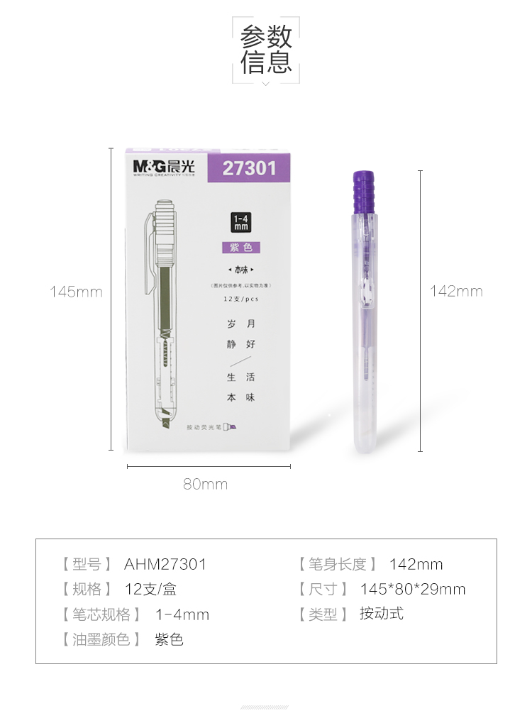 晨光(M&G)AHM27301本味按动单头荧光笔12支紫色