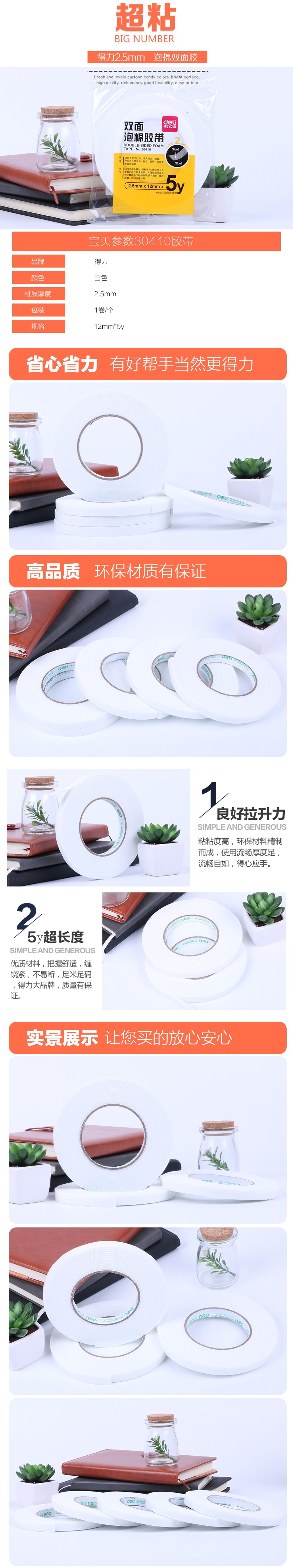 “deli/得力”No.30410 双面泡棉胶带 单卷装(白色12mm*5y*2.5mm海绵胶纸广告胶粘胶条胶布泡沫胶EVA办公用品1卷/袋)