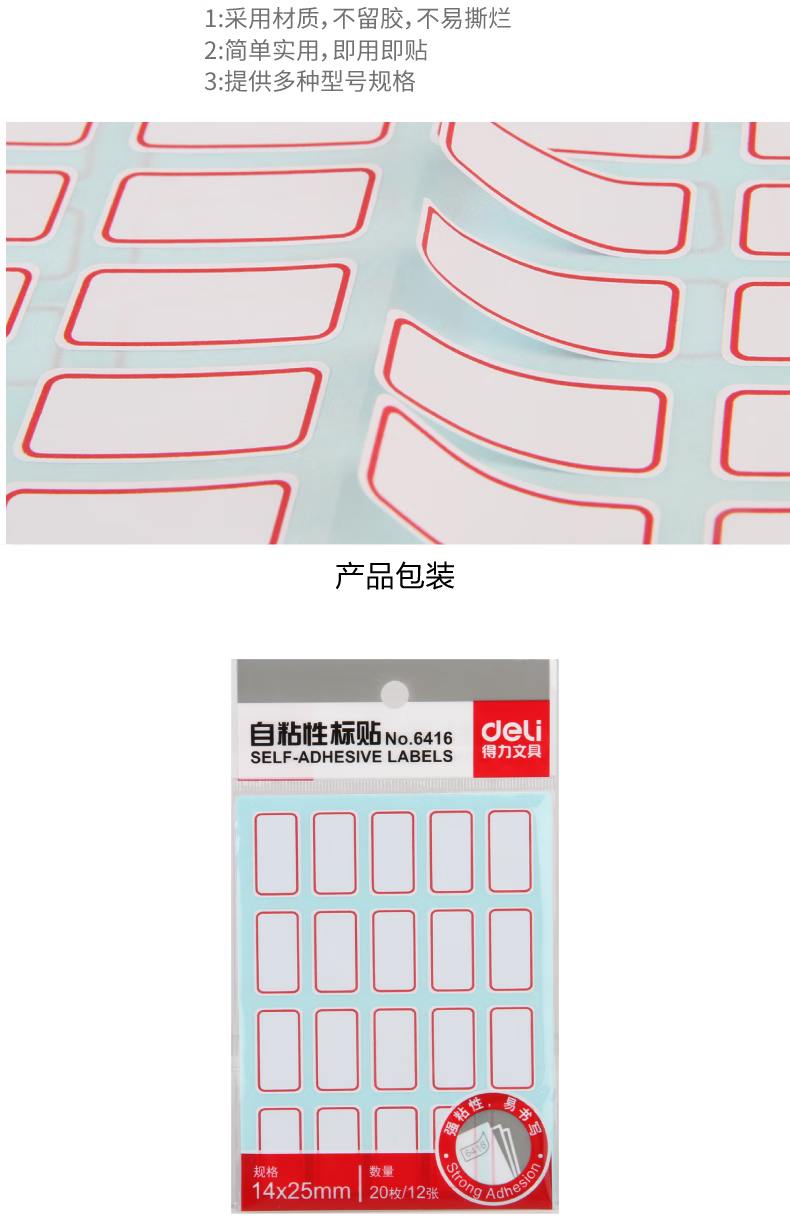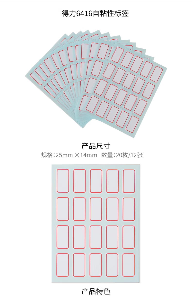 “deli/得力”No.6416 自粘性标贴 1卡装(白色14*25mm不干胶纸贴纸空白标签纸标签贴口取纸姓名贴20枚*12张/卡)