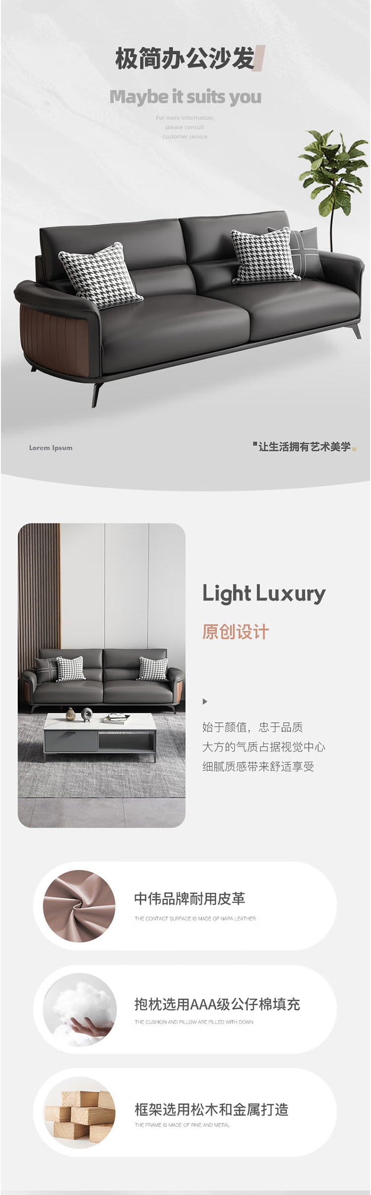 “ZHONGWEI/中伟”三人位+双人位+单人位+长几 沙发 1套装(办公沙发茶几组合办公室沙发商务接待会客洽谈沙发简约现代皮沙发)