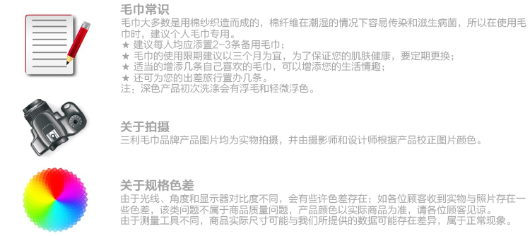 三利毛巾,妈妈放心!<br> 等级:一等品<br> 特性:毛圈规律、吸水性强、柔软舒适、经典格纹<br> 成分:100%棉<br> 规格:毛巾(33x70cm)/1条<br> 颜色:灰格